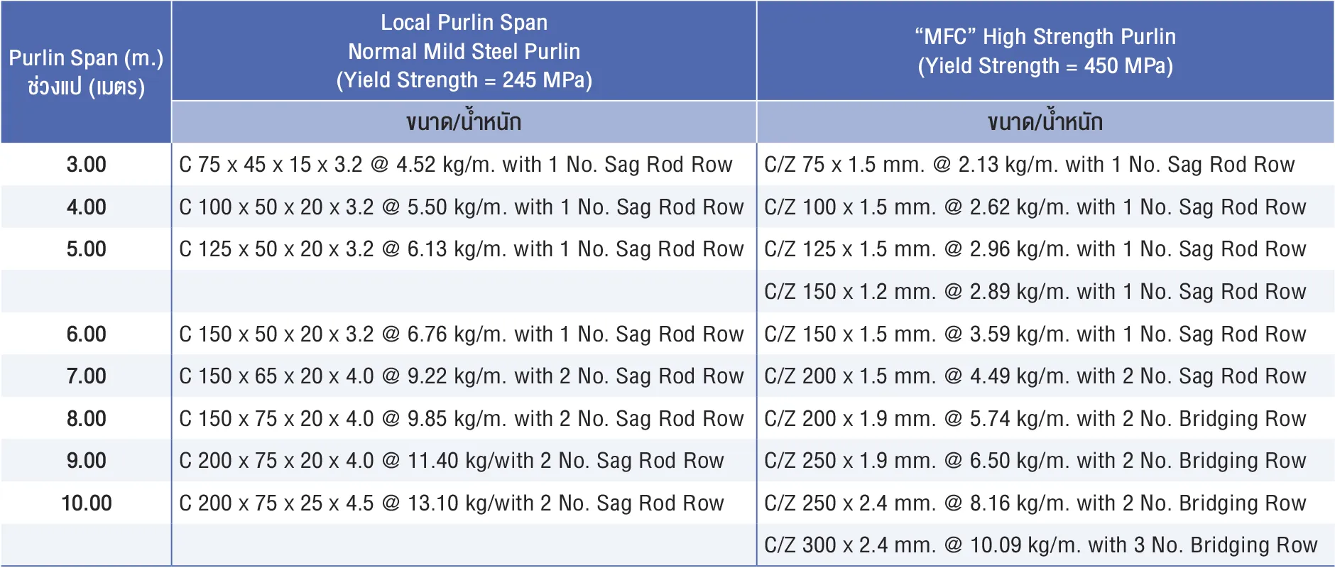 การเปรียบเทียบ แปเหล็กกล้ากำลังสูง รูปตัว C และตัว Z กับแปเหล็กทั่วไป สำหรับช่วง Span