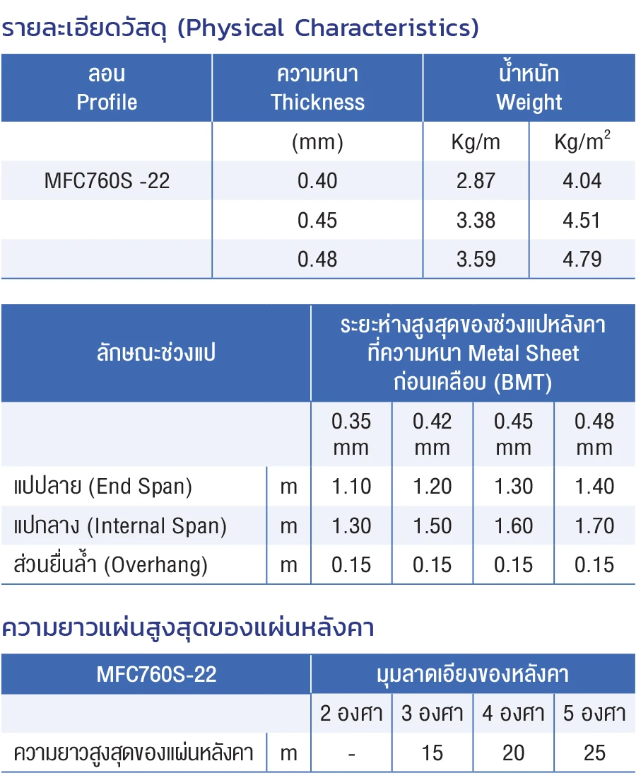 • สันลอนสูง 22 มม. ความกว้าง 760 มม.